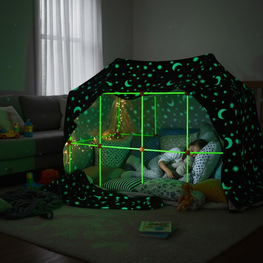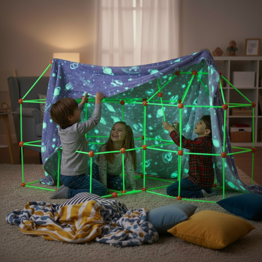 Durch das clevere Stecksystem bleibt alles sicher zusammen. Besonders stabil wird es, wenn eine Decke oder ein Tuch über die Konstruktion gelegt wird – perfekt für Höhlen, Burgen oder Raketen!